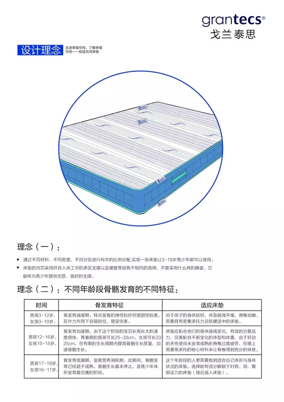 这个设计点真的要给一百个赞,从儿童到青少年,针对骨骼与身体的成长进行了人体工程学的分心,通过对发泡材料密度和软硬度的控制,来完美匹配儿童至青少年期间的睡眠需要。
