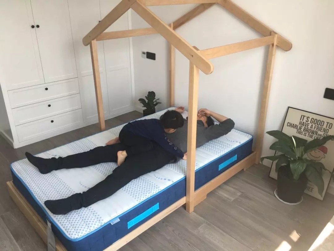 我儿子简直高兴疯了,开始了他的弹跳表演。而我一直在不停的闻闻闻,事实证明都是白担心,一点点刺激性的刺鼻味道都没有,稍微有点属于床垫本身的那种味道可以忽略不计。后来才了解到,这张床垫竟然没有使用过一滴胶水!这是什么神仙黑科技!