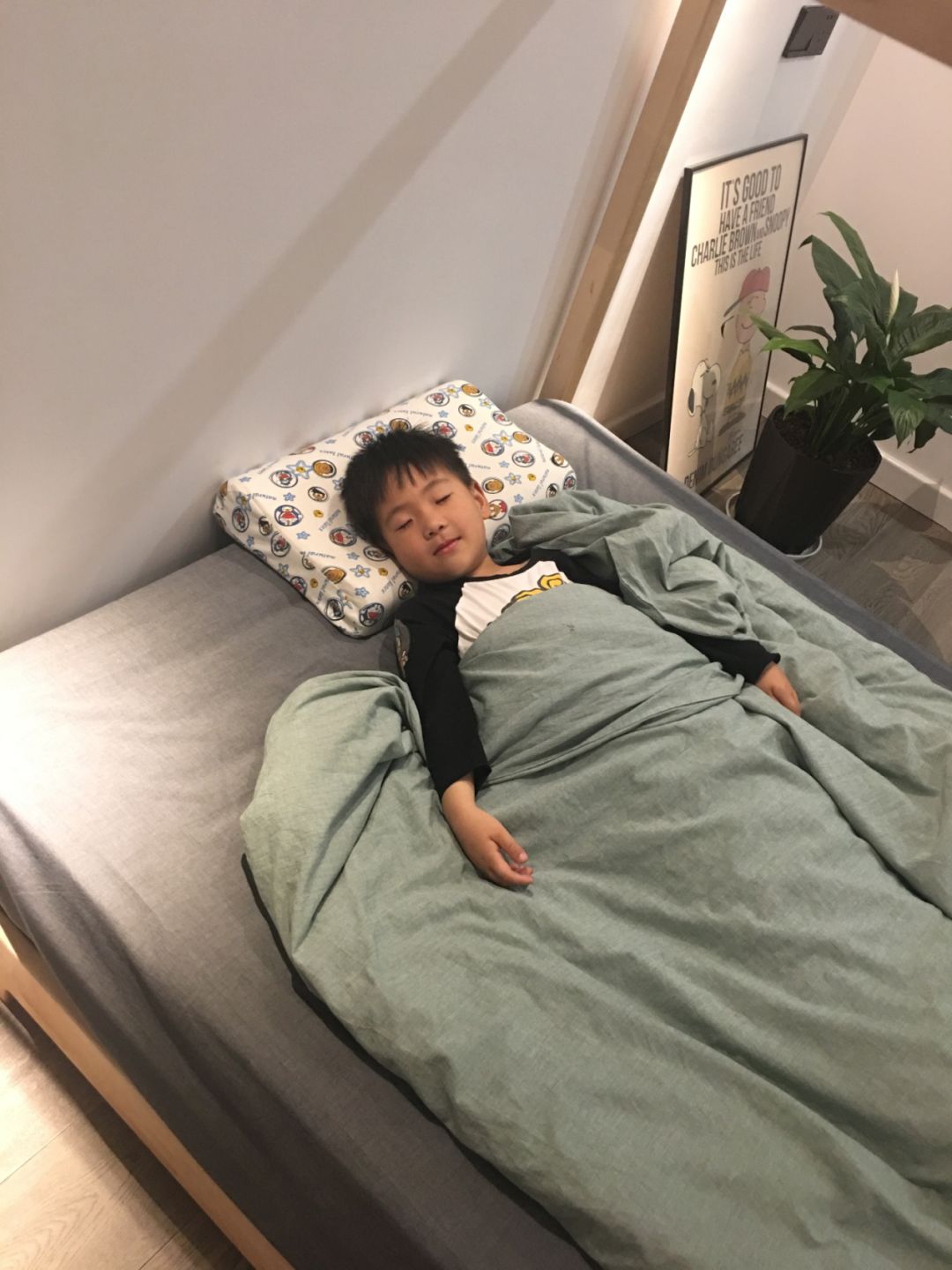 床垫是意外的中奖,所以还没有准备专门的儿童四件套来搭配,我儿子说了好几遍要盖着被子感受一下,所以来看图吧。应该配一个井上儿童枕的,15号团购下手一个。