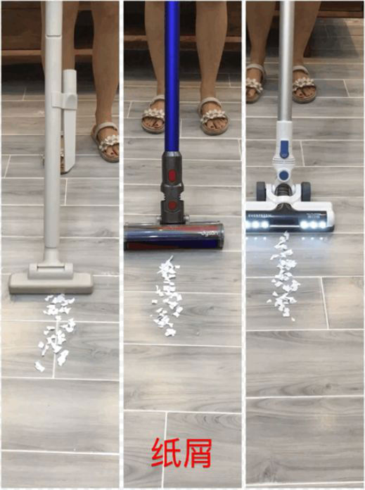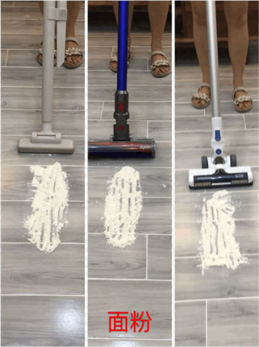 总结:3台机器对于面粉的吸附能力都还不错;对于大颗粒和头发,正负零明显弱于后两者;纸屑比较难吸,戴森看似吸的比较干净,其实都依附在拖地刷上面,没有完全吸附进去。