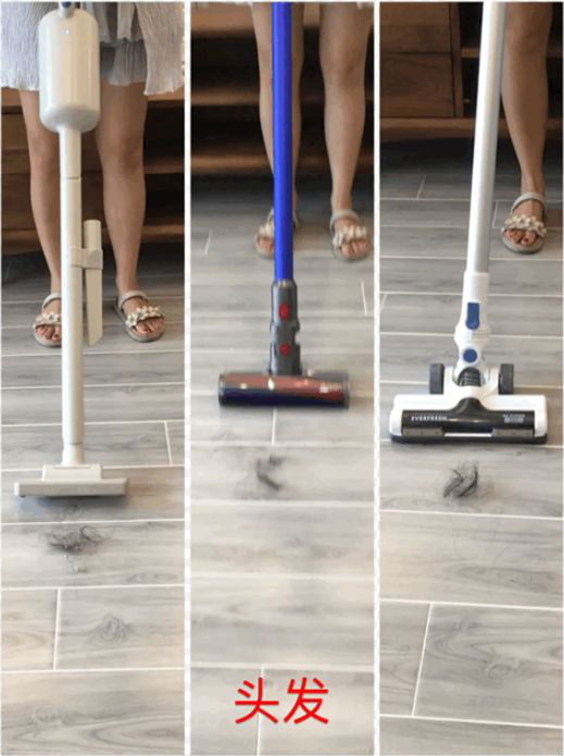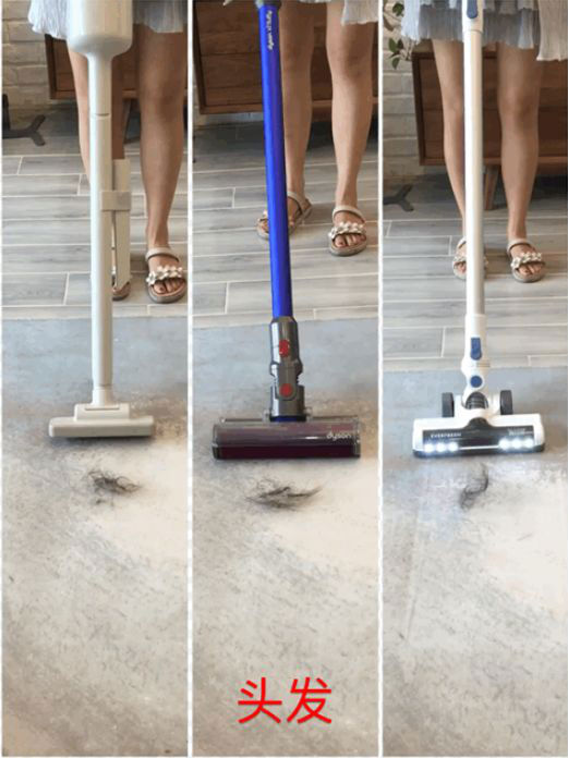 总结:在地毯上向前推动时正负零最省力,EverFresh次之,戴森最难推。因为V7没有地毯专用头(V8才有),所以会产生阻力;吸尘能力正负零明显弱于后两者,戴森和EverFresh都不错,但是在最后的头发上EverFresh完胜!