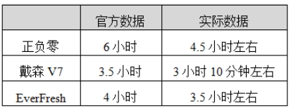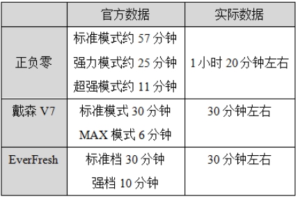 PS:本次测试在标准模式下进行,正负零使用时间最长令人震惊,戴森和EverFresh势均力敌。此外,EverFresh具有的优势在于6节三星原装电芯,电池可拆卸设计,随着备用电池个数增多,续航时间可翻倍至60min甚至更长时间。