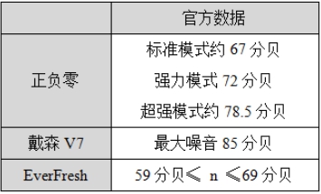 手机上下载了几个测噪音软件,不过测试下来感觉不太准确,没有专业的工具无法进行测试感到非常抱歉,在这里给大家列出了几个官方数据进行参考。根据人耳听到的进行判断,正负零小于戴森小于EverFresh,但是都在可接受范围内。