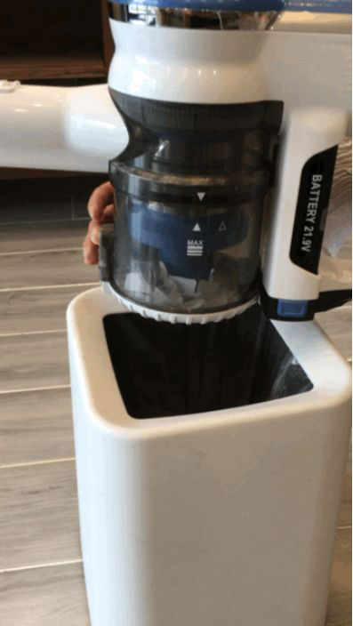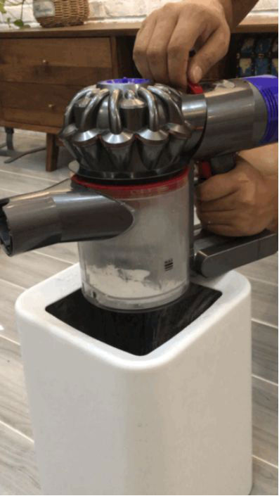 戴森V7:向上拉尘桶顶部的红色按钮,力气小的女生拉比较吃力。