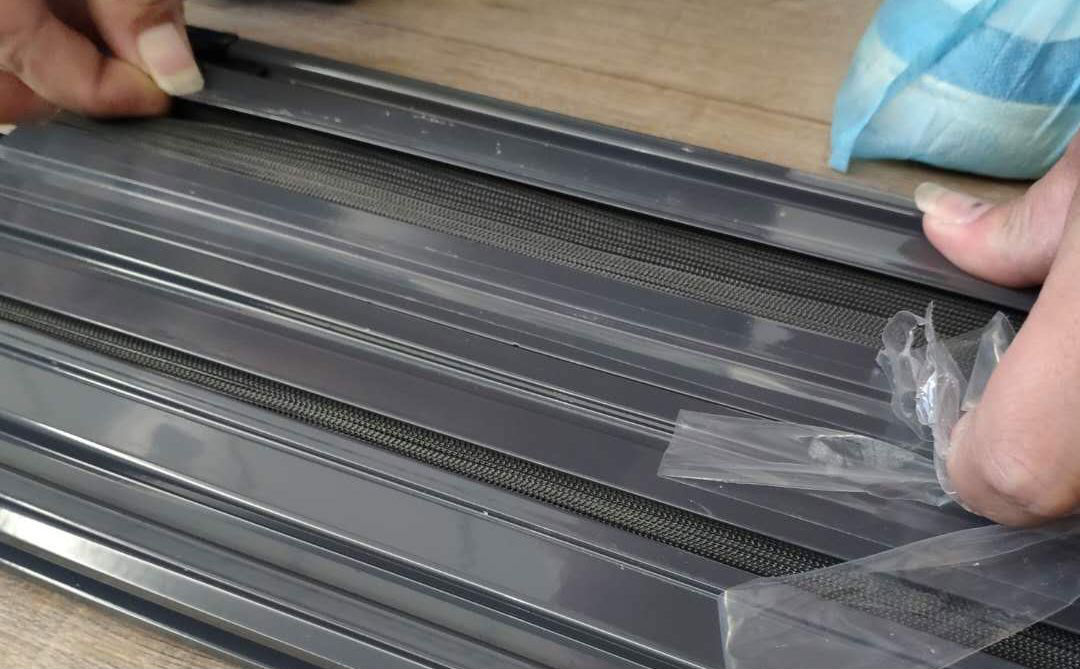 框体两侧必须先加上毛条,为了避免灰尘和小虫子从窗户和纱窗之间进入室内。