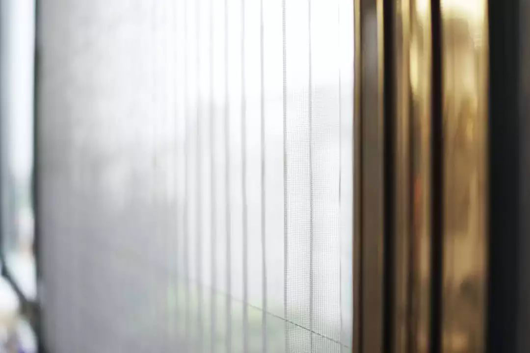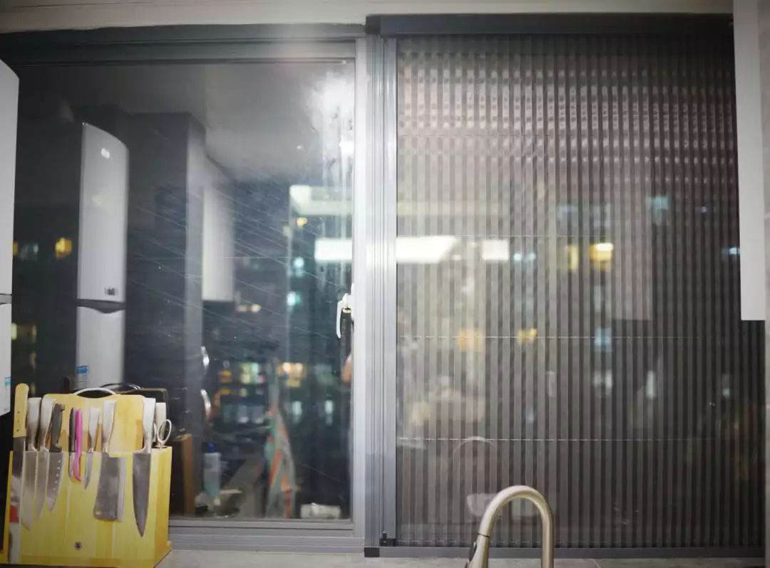 减法做到这里,似乎只剩下折叠纱窗了。因为手在纱窗框的任何位置推拉,都很顺畅(前面的动图已说明)。但纱窗反复折叠对于纱网的坚韧度有更高的要求。玻纤容易脆断,早前用pp做折叠纱窗的,也多少存在使用寿命的问题。特别在北方,pp的材质在接近-35℃时容易脆化,更何况紫外线照射下容易老化分解。这也是为什么楼楼家旧的纱窗,老化变硬。(网上也有说法,高温下PP会释放一定量的甲醛)况且pp的防水、抗油、防尘会弱一些,于是长时间堆积的尘污,夏天照射后,风一吹,便夹杂着一同进入室内,想想都不寒而栗。