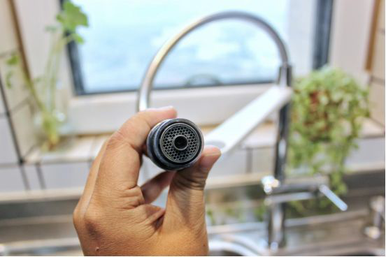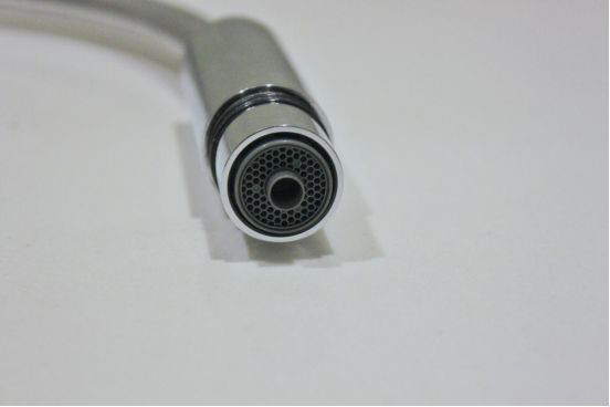 龙头的起泡器主要是塑料,是GRB自主生产的,可以看到,中间的一个小圈,其实拆下来可以看到它连接了内部一根净水软管,这里就是净水的出水口。周围一圈,就是日常用水的出水口。所以,不用担心水质之间混淆交叉污染。