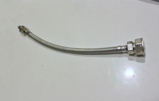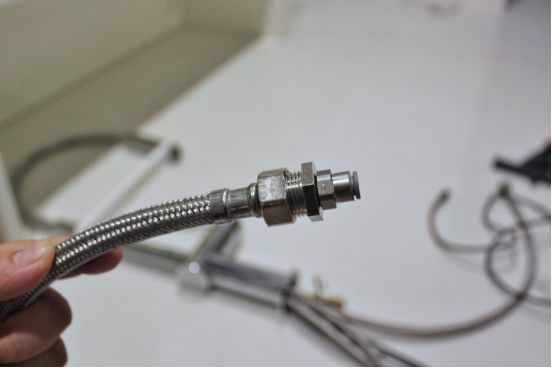 1:两根钢丝软管接近龙头内,后期两根钢丝软管都要接好转换接头后接上我们家中冷热水管的进水口
