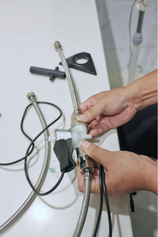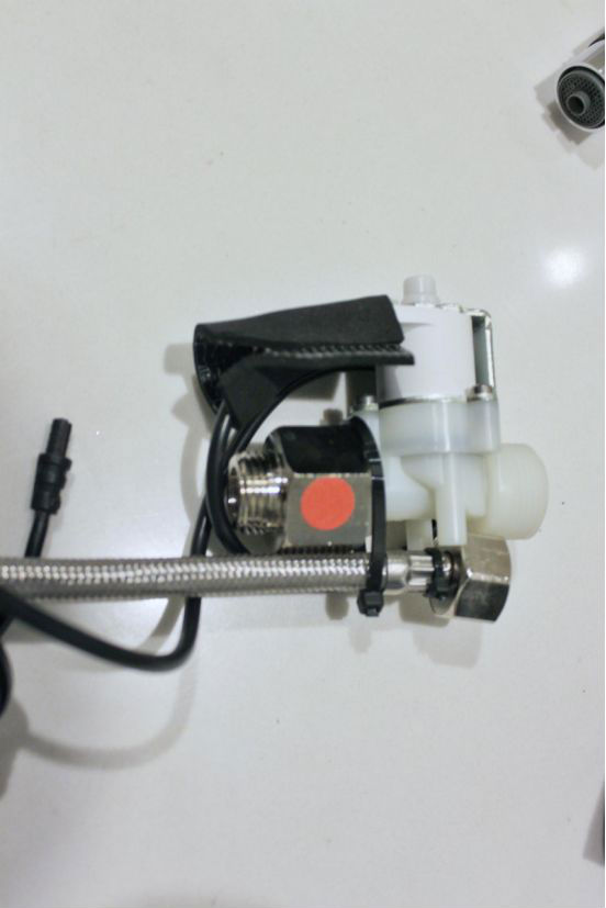 配件中的净水连接件和中间那根连接后与家中净水器的出水口连接