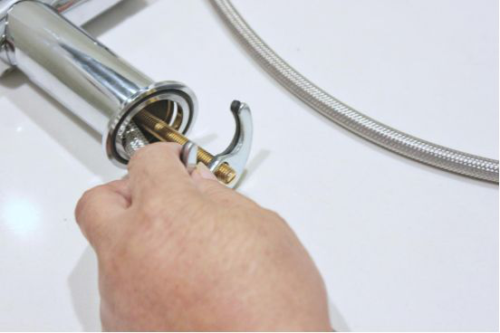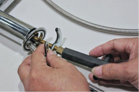 先把龙头装饰盖套好,然后一个人在上面扶着水龙头不要让它摔倒。另一个人在台面水槽下面,先盖上塑料的三角件后套上单孔马蹄片,然后用它给的工具,把黄铜螺丝转紧固定好水龙头即可。