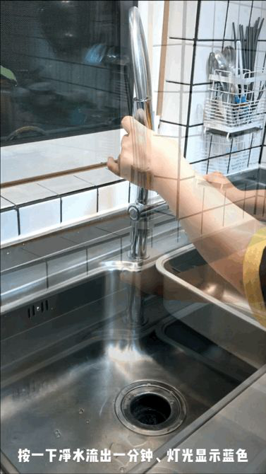 连按两下,显示绿色,净水会自动流淌五分钟后关闭。这个作用就很智能了,净水出水的水流一般不会特别大,我们倒一壶水需要一段时间,一直站着等也比较浪费时间,这样就可以在放水时候去干别的事情。