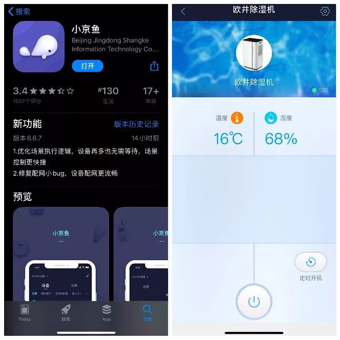 使用之前,必须先捣鼓一下手机app!目前家里已经购置了不少智能家电,特别享受提前开空调/开暖气,随时“监视”家中情况的体验。即便本身不智能,我也会想办法通过智能插座强!行!智!能!。小欧就不存在这个问题啦,因为这款是特别搭载“小京鱼智能助手”的,只要根据操作说明下载小京鱼APP,然后扫描机身上的二维码添加,就可以在手机上远程控制了,预约开机、指定模式等等,随时随地开启干爽生活。