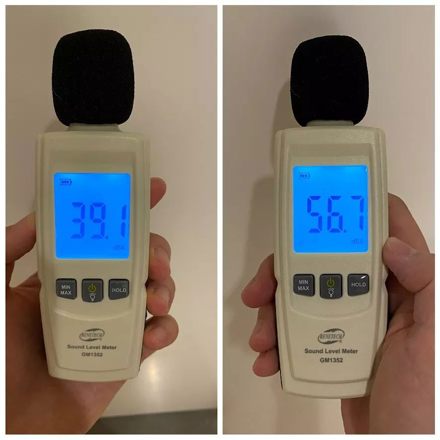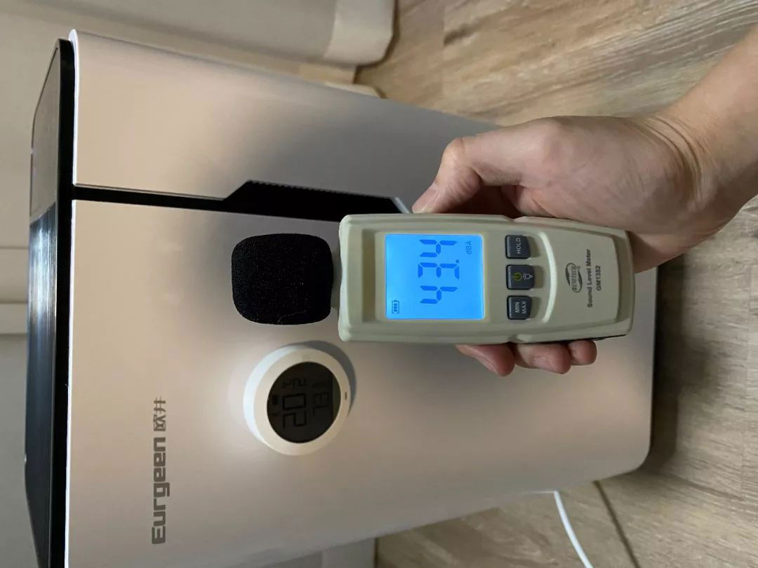 Anyway,开启前不忘测一下分贝值,由于卫生间有一定的“回声”,而且考虑到卫生间关上门可是正常操作,所以这里就直接测了关上门时,开启除湿机前后的分贝值: