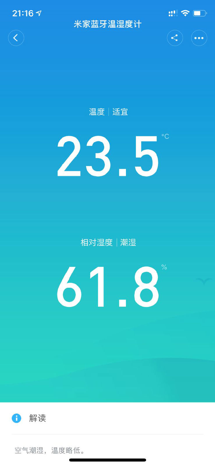 时间来到了晚上21点16分,我看了一眼米家的温湿度计