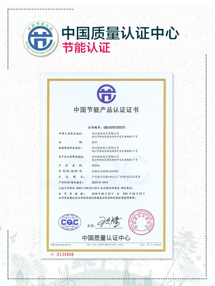 效果一级棒的同时,小欧也得到了中国质量认证中心的节能认证噢!235w额定功率,4小时0.94度点,不到1度电,即可轻松享受干爽生活,大力除湿的同时也不用担心电费蹭蹭蹭噢~