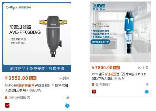 比如3M小灰盒系列、AO史密斯2000s款等等,动辄4 5000元的价位中,研集明选的团购款价格只有一半左右,而过滤精度却相差不多。A600款对标产品中,还有以下这两款净水器型号,不如看看参数比对,你懂的。从产品参数到后期的耗材成本,工厂净水器都有超越性的优势。代工厂所能提供的,无非是节省了品牌营销成本后的产品服务。同样,性价比更高的还有溢泰的B350款,团购下来不到1500元就能买到的带有储水桶的款式,堪称“性价比之王“,还可以包邮到家~有了末端,自然不能少了“黄金cp”的前置过滤器。虽然现在的民用水都是经过多次过滤消毒凝絮沉降等严格工序的水质检测,尽管经过自来水厂的谁都符合正常的引用标准,但水源中会在输水管道这一环节中出现二次供水的水源被污染的情况,比如水管生锈,水管内部就容易有细菌,杂质等沉淀堆积,久而久之就会影响家里的水质。而作为家里进水的第一道防线——前置过滤器,搭配使用,基本上完全可以解决大家对净水的需求,因此我们也挑选了3款不同价位的产品。高压冲洗+免拆洗+双面刮划的冲洗方式作为潜质过滤器中最优秀的冲洗方式,过滤起来效率十分高。其中倍瑞康T4-R7款对标的是德国倍世、以及康丽根的4T款,在功能相同的同时,价格确实相差许多,一半不到就能省下净水预算。