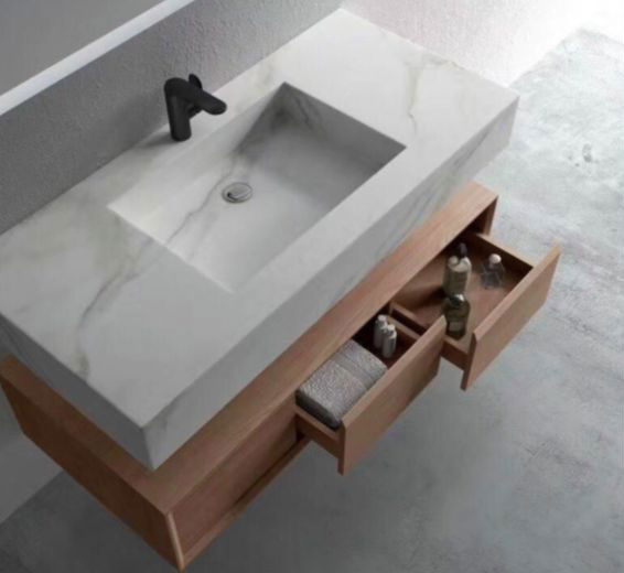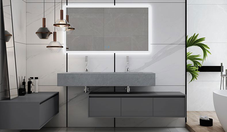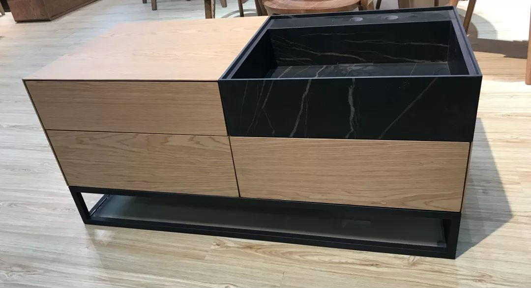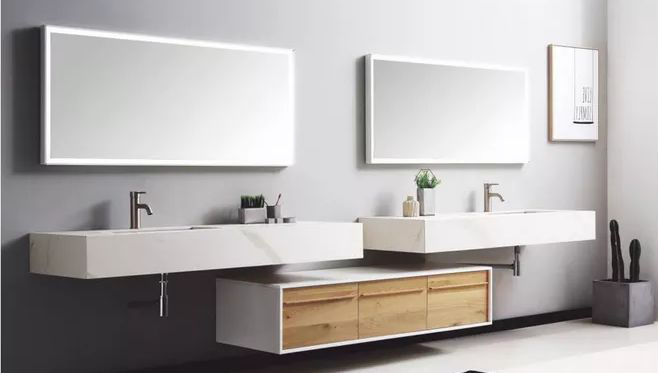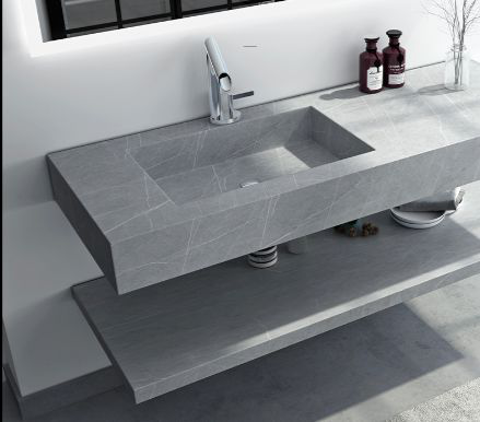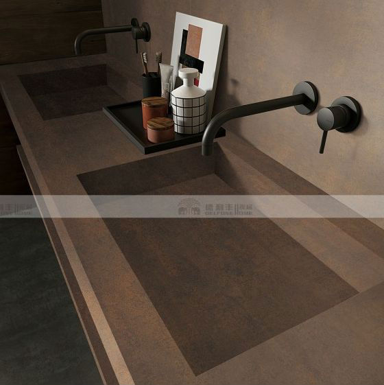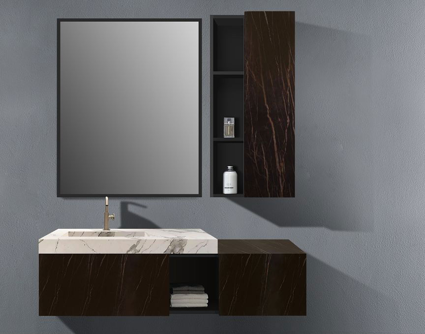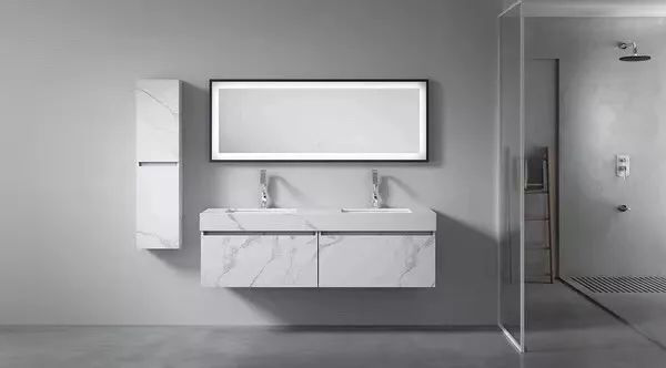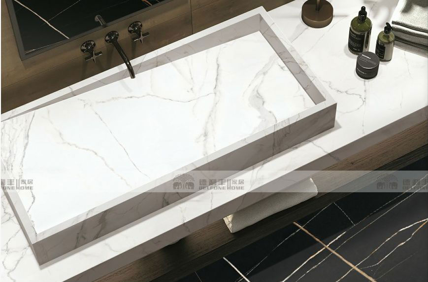 由于卫浴产品对防水抗污的要求很高,本次选材有国产岩板徳利丰12mm的岩板产品以及进口意大利LAMINA超薄6mm岩板两种选择,作为台面适用的厚度,实力抗砸抗划,表面3D打印逼真石纹,抗污抗渗。