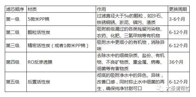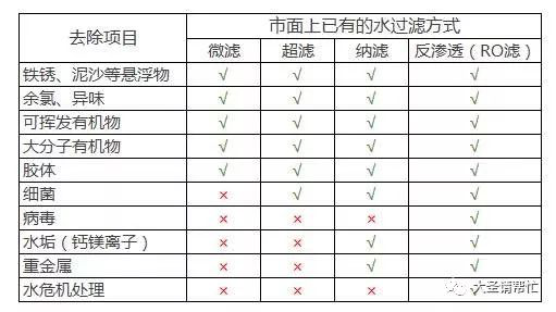 市面上常见的水过滤方式有微滤、超滤、纳滤和RO(可覆盖99%),对应自来水中可能含有的以下物质,过滤能力如下表: