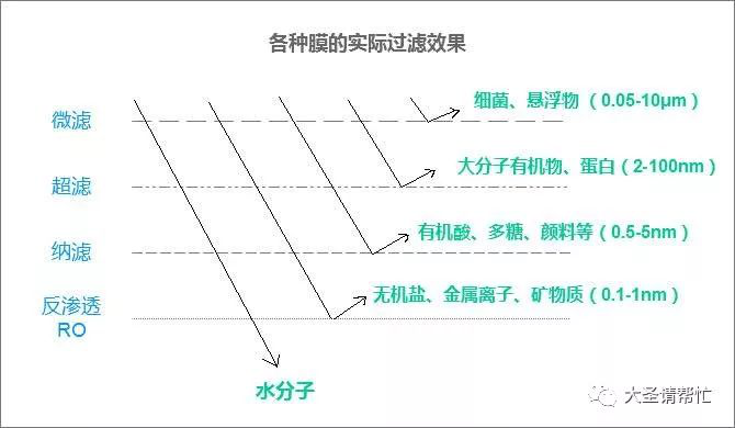 如果我们把不同的杂质想象成大小不同的鱼,不同的过滤方式就是孔大小不一的渔网,按孔径大小来表达就如下图: