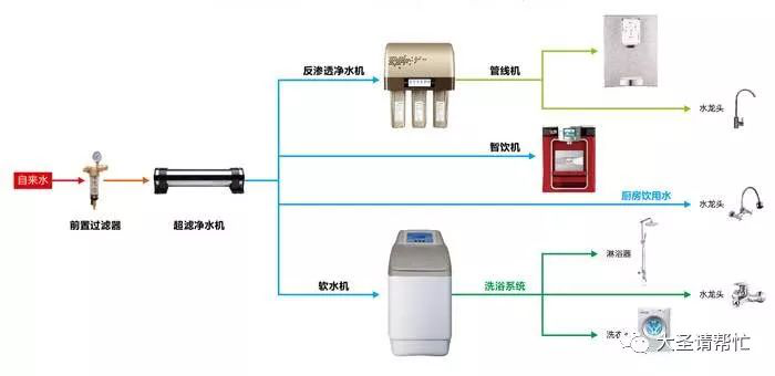 净水系统说白了就是根据你家的需求选用不同的净水设备打造的一套水处理系统而已,借用一张某国产品牌的宣传图: