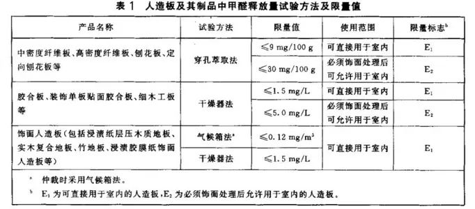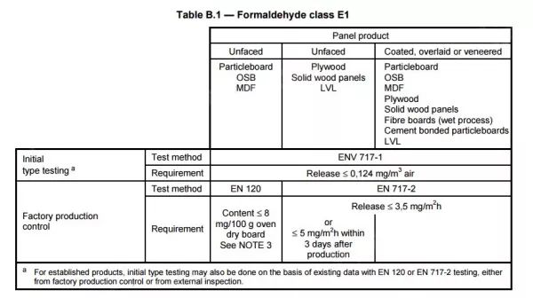 欧标的等级也分为E1和E2。上表正是关于E1甲醛释放量的相关规定标准,而E1的甲醛释放量为0.5mg/L