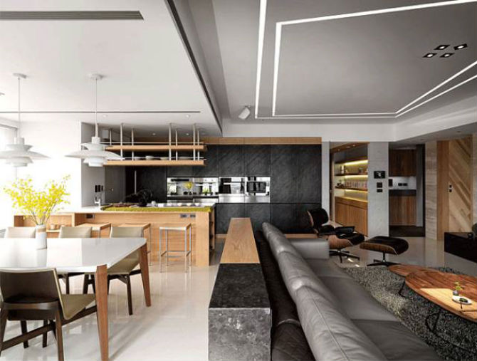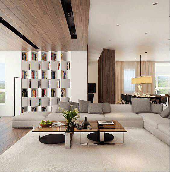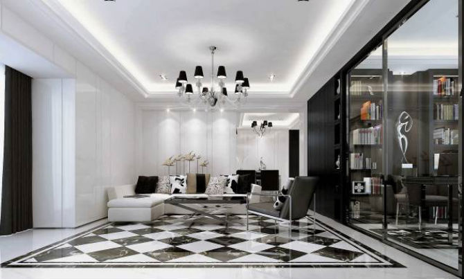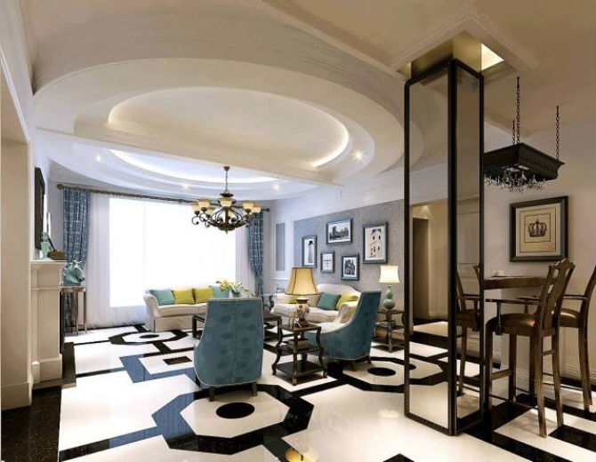 如过你家有一个很大的客厅,这样可以选择设计了一个造型别致的吊顶,周围的厚度按时针方向增加,使平面的天花板呈现出立体感。