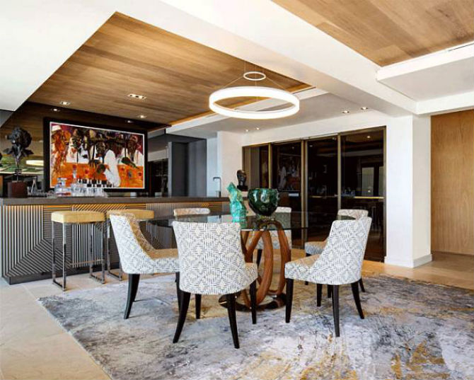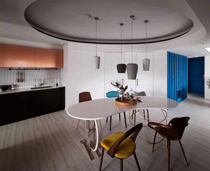 圆形的吊顶对应上圆弧形的餐桌,在选择一些类似的圆弧状吊灯,使原本空荡荡的天花板不再单调,而且协调统一。