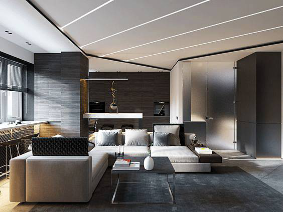 我们可以用简洁的线条来勾勒出吊顶的层次感,这样一来客厅和厨房的区域就被巧妙地区分出来,灰白色基调与沙发色系搭配和谐。