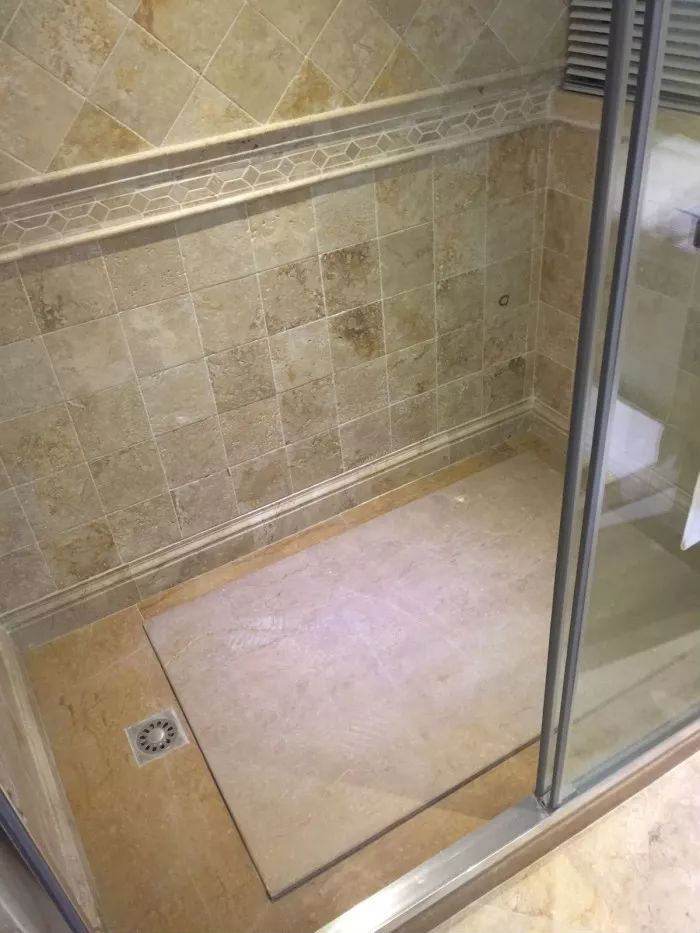 有些家庭为了卫生间的美观,淋浴区的地砖和干区的地砖选用大瓷砖统一铺贴,虽然效果是很大气,但是这种大砖,最不好找坡。