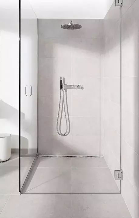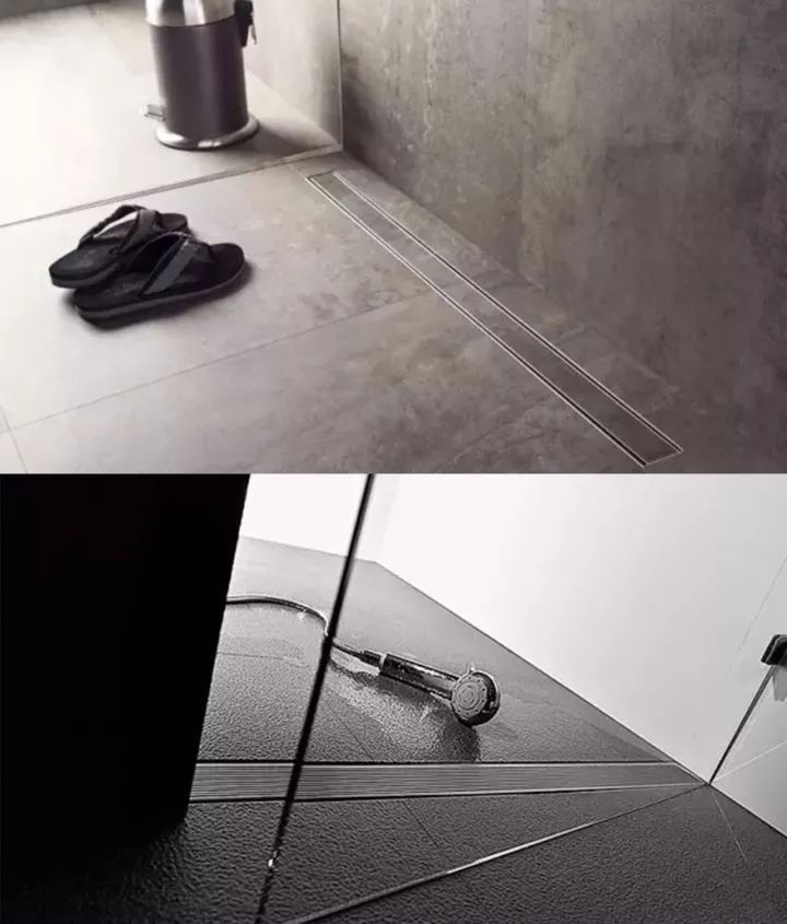 如果你喜欢在淋浴区铺贴大的瓷砖,又想要排水快,用长条形地漏代替方形地漏不失为一个好办法。